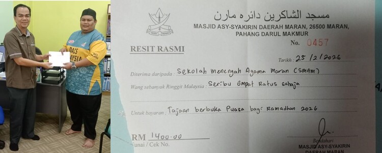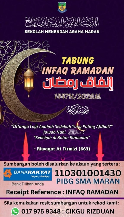Disepanjang bulan Ramadhan 2026, program yang dilaksanakan setiap hari ialah solat berjemaah di Dewan Tun Abd Razak, diikuti dengan sesi Tadarus Al-Quran dan pada sebelah malamnya solat terawikh berjemaah di Dewan Tun Abd Razak, SMAM. Semoga bulan Ramadhan ini menjadi lubuk pahala bagi Warga SMA Maran. InsyaALLAH.